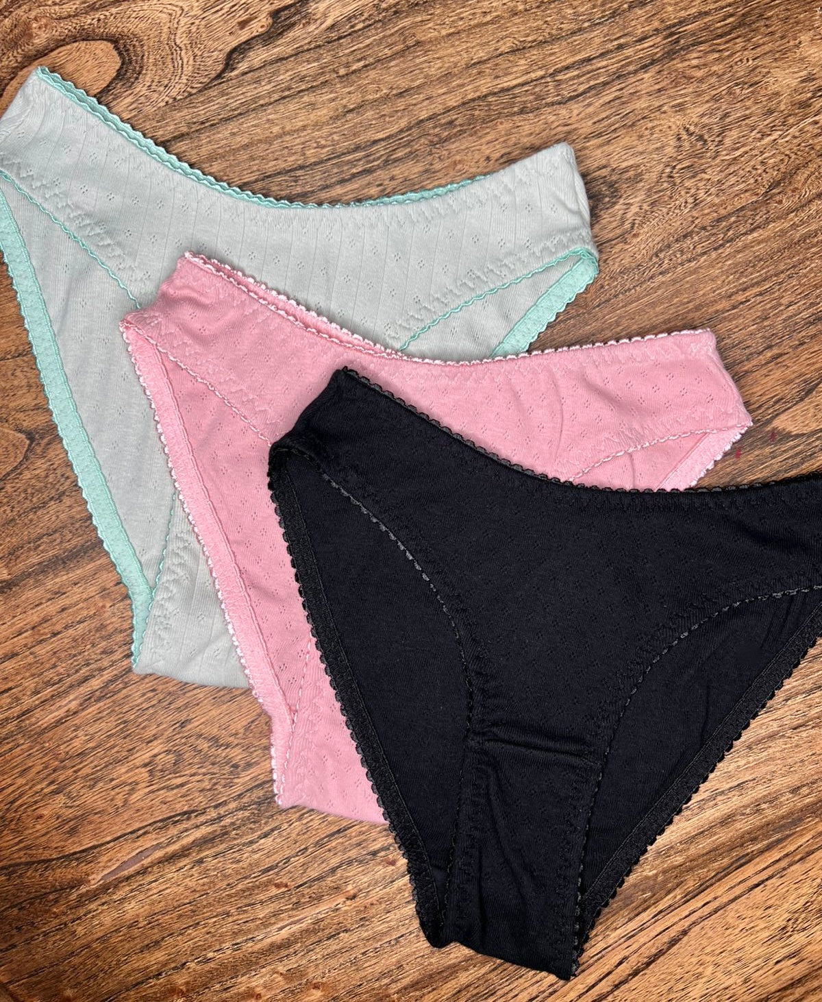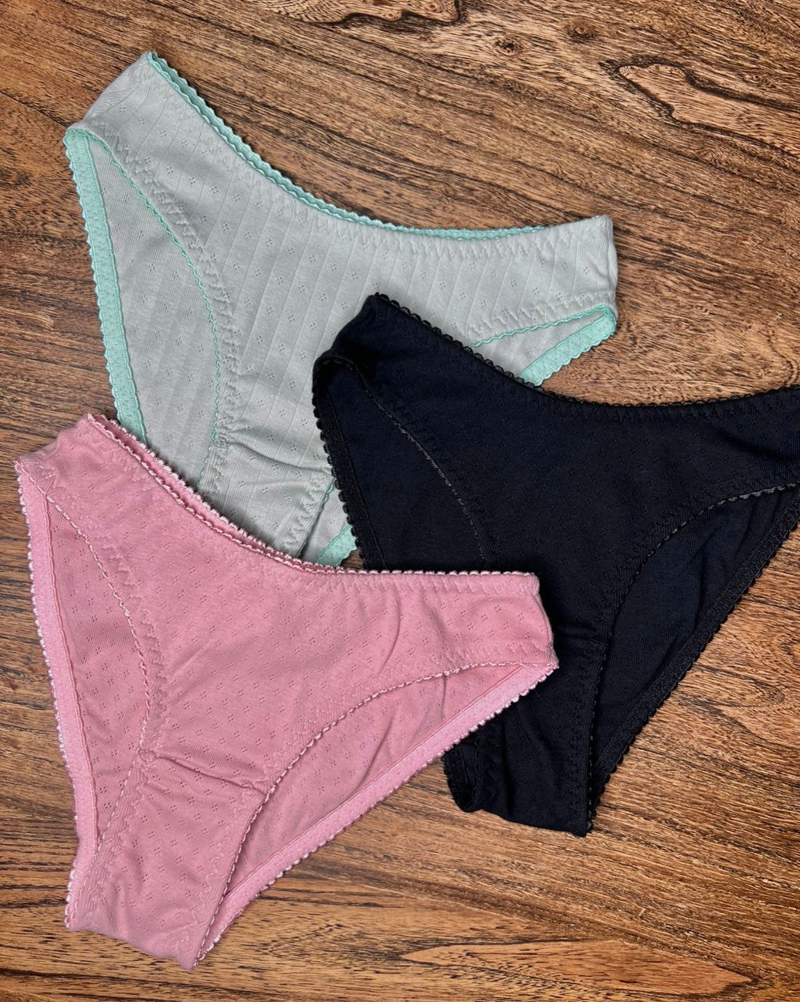 Paquete de tres piezas de calzones corte francés, hechos de algodón orgánico pointelle, color negro, rosa y verde pastel.