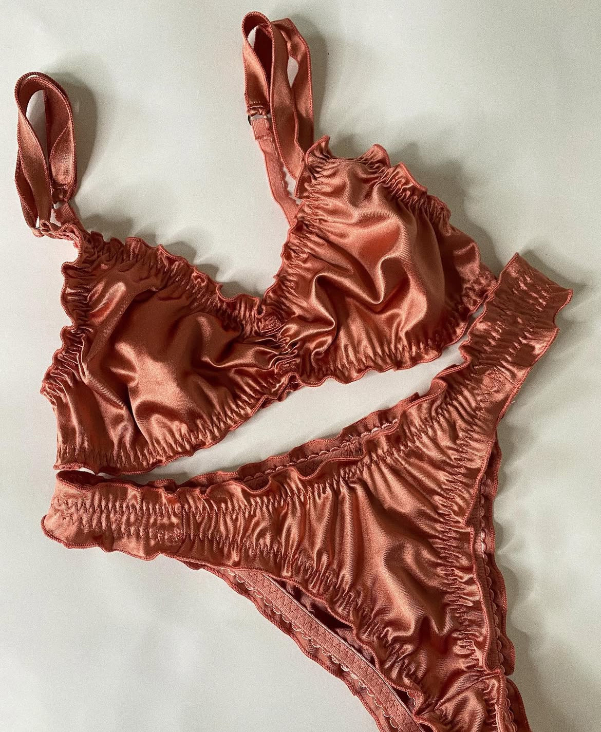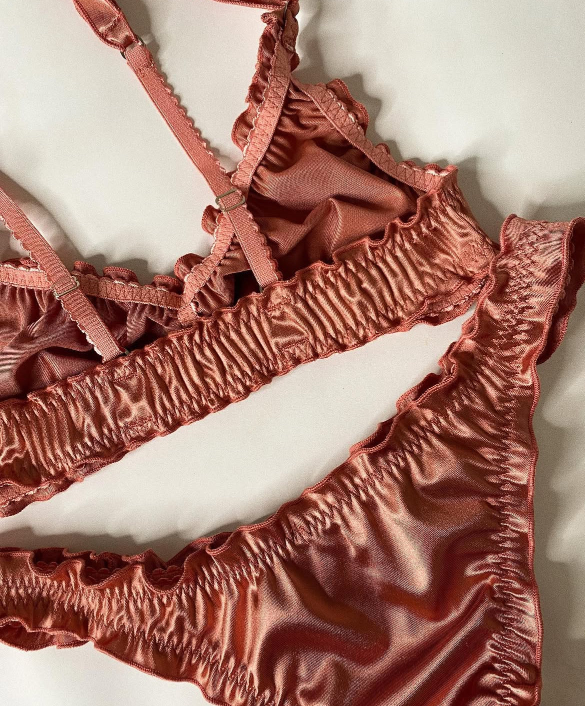 Set de dos piezas, elaborado con suave satén rosa quemado, top sobre tirante justable a juego con ruffle panty.