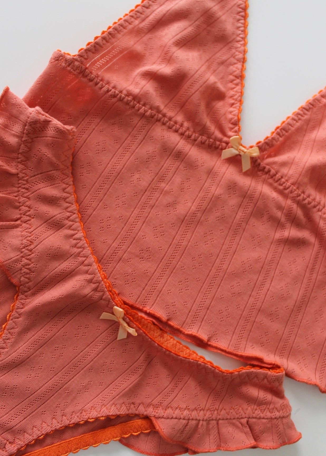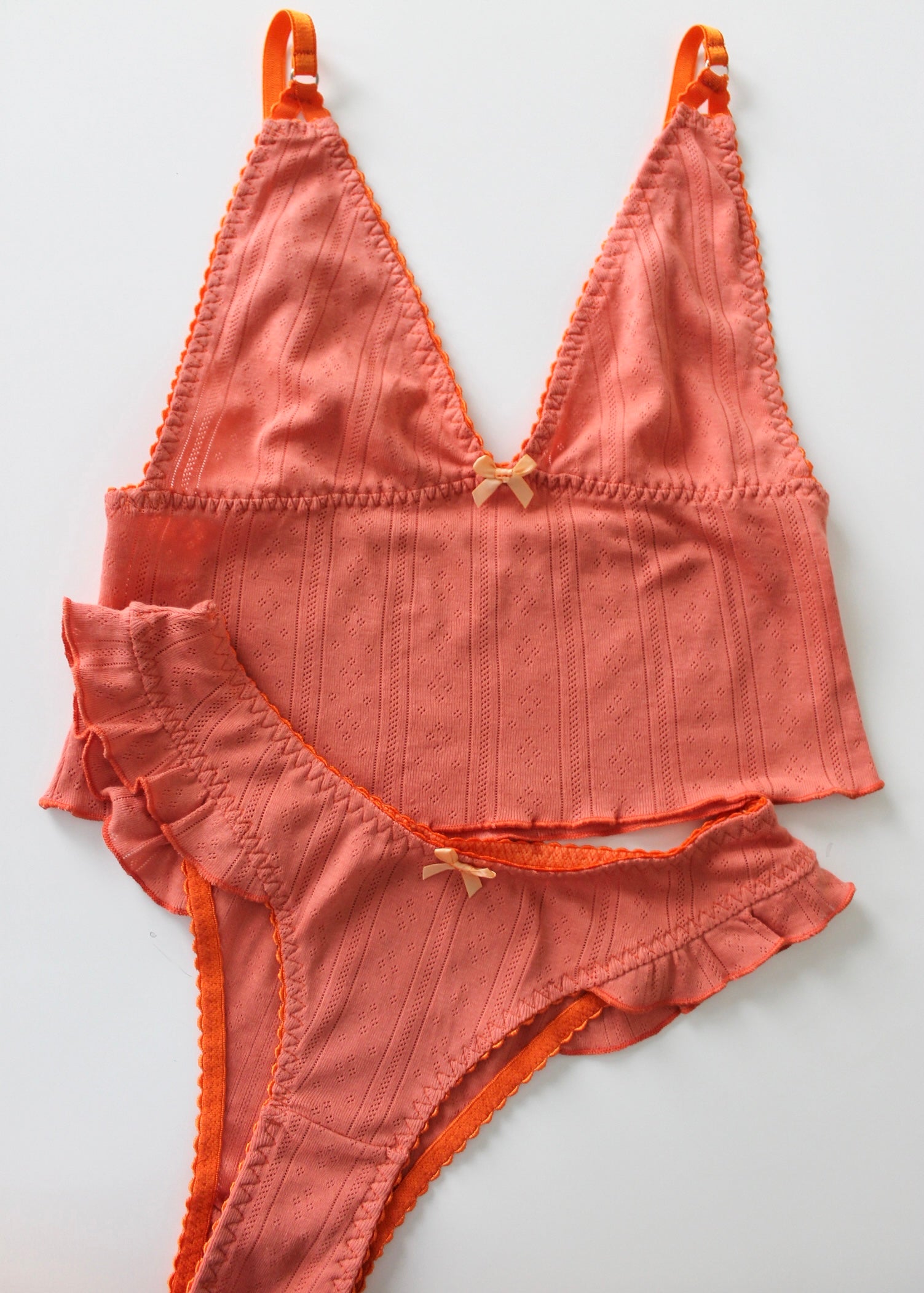 Set hecho de algodón orgánico pointelle, top escotado y panty corte bikini con olanes a los costados.