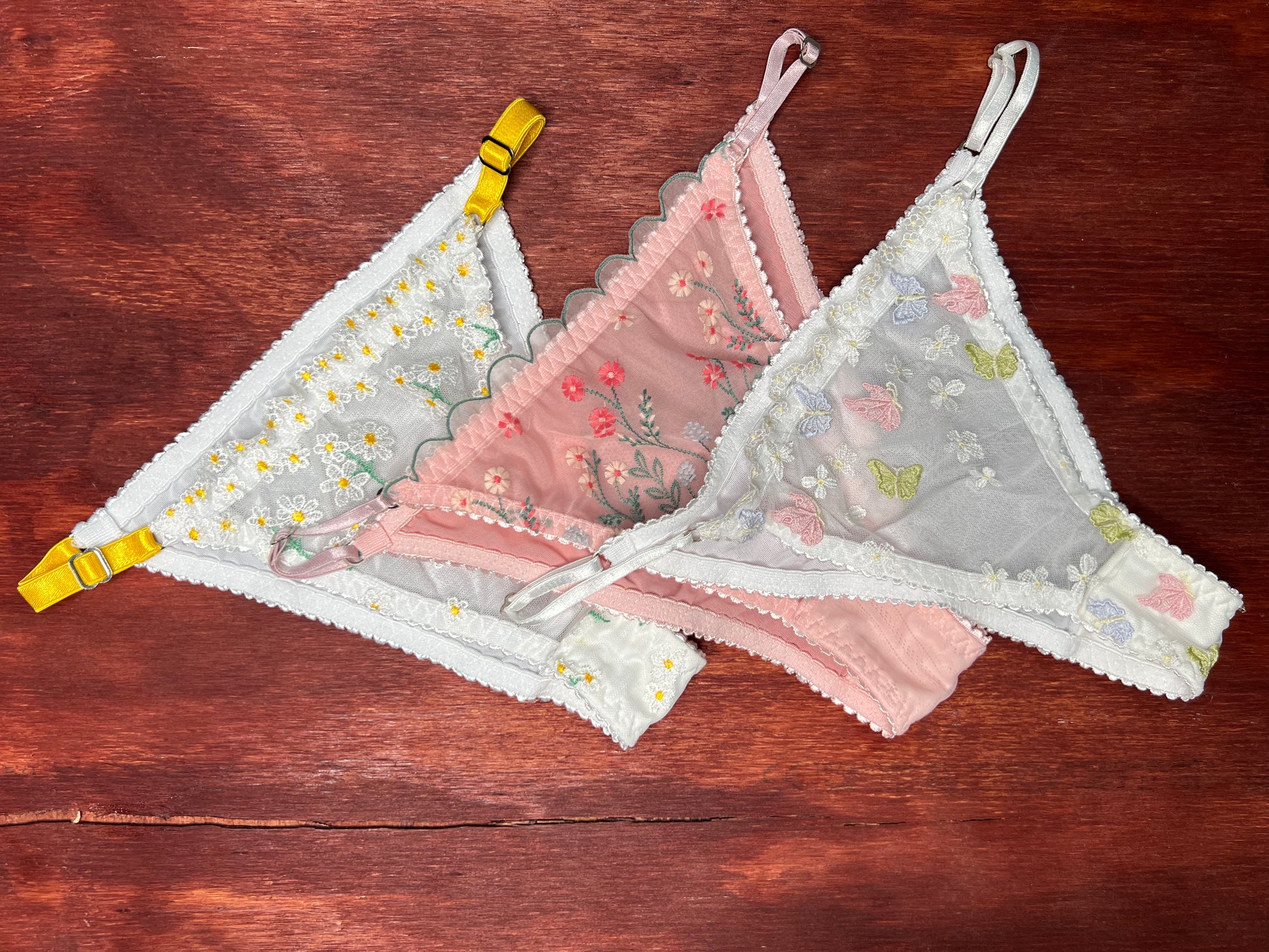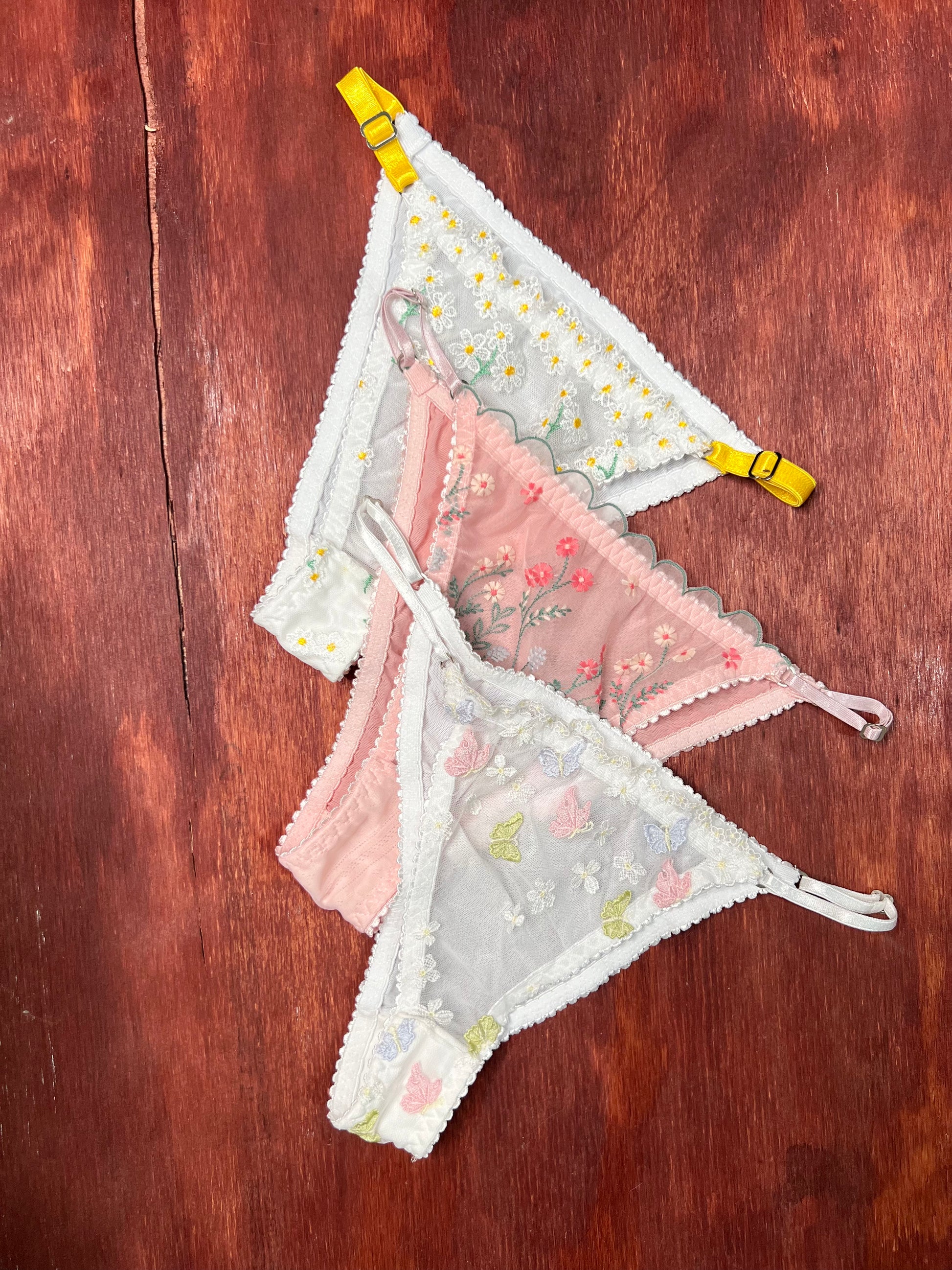 Set de tres panties ajustables elaboradas con Tul bordado y mesh. 1 panty margaritas, 1 panty rosa flores y 1 panty mariposas.