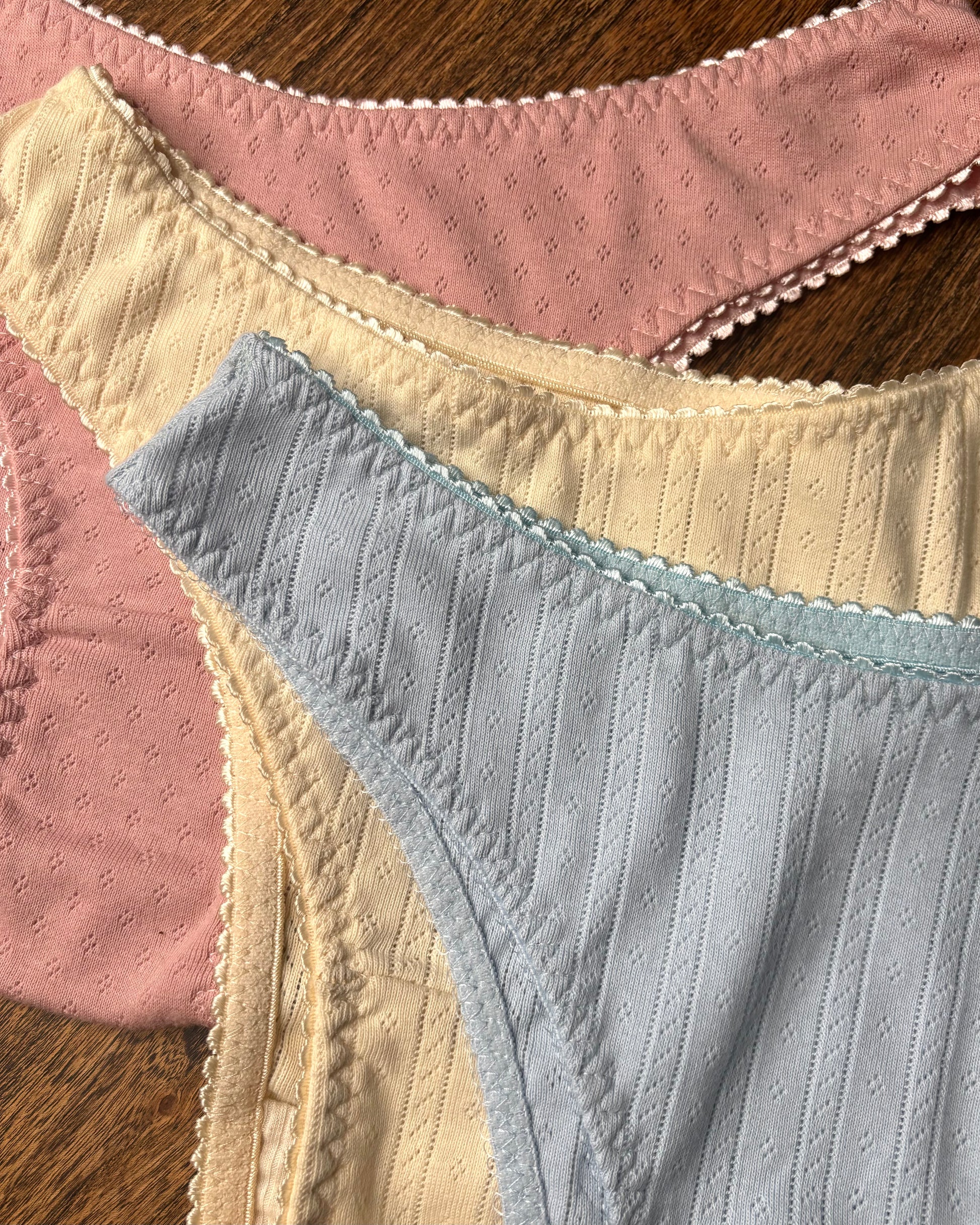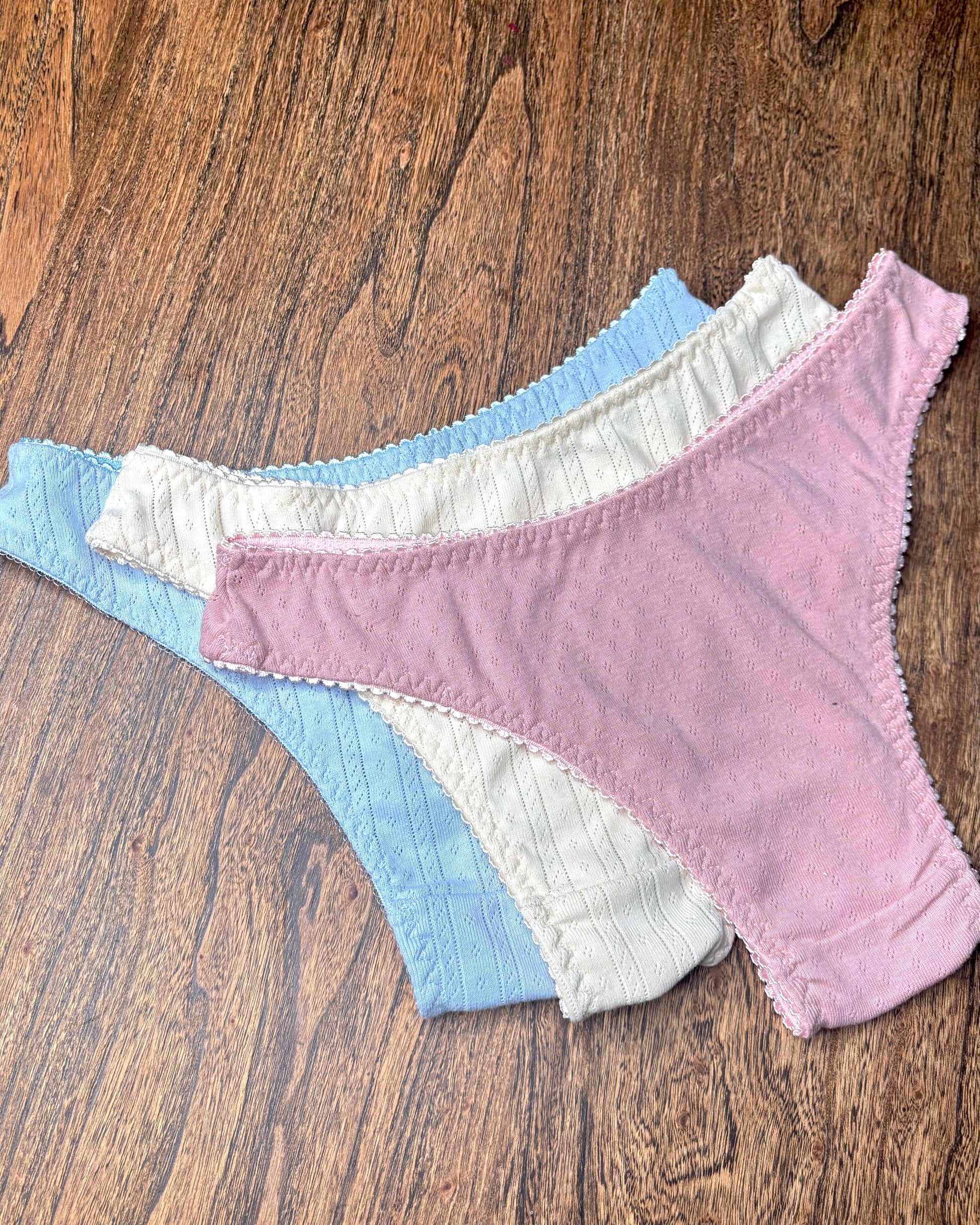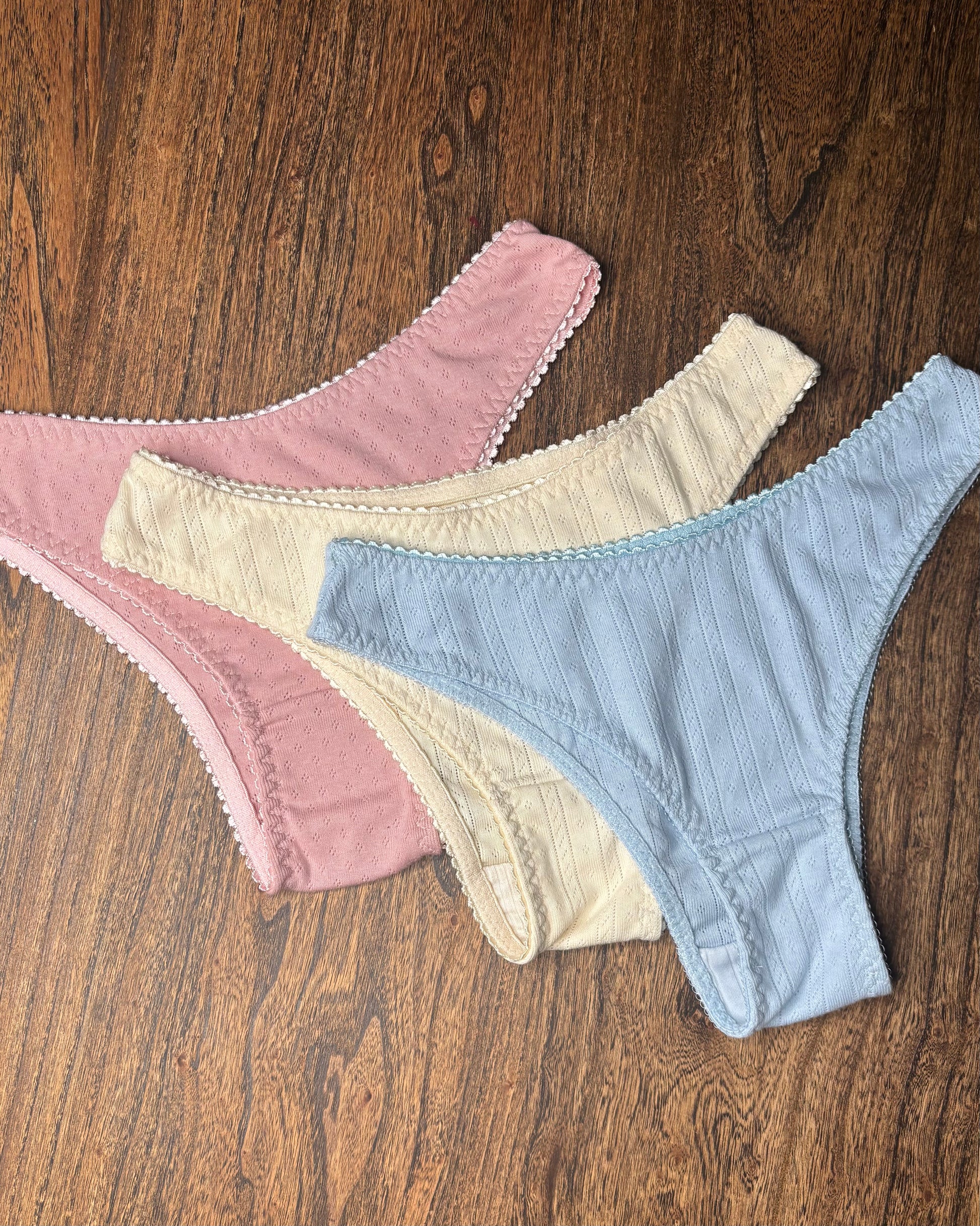 Corte bikini clásico, colores: amarillo pastel, azul y rosa quemado.